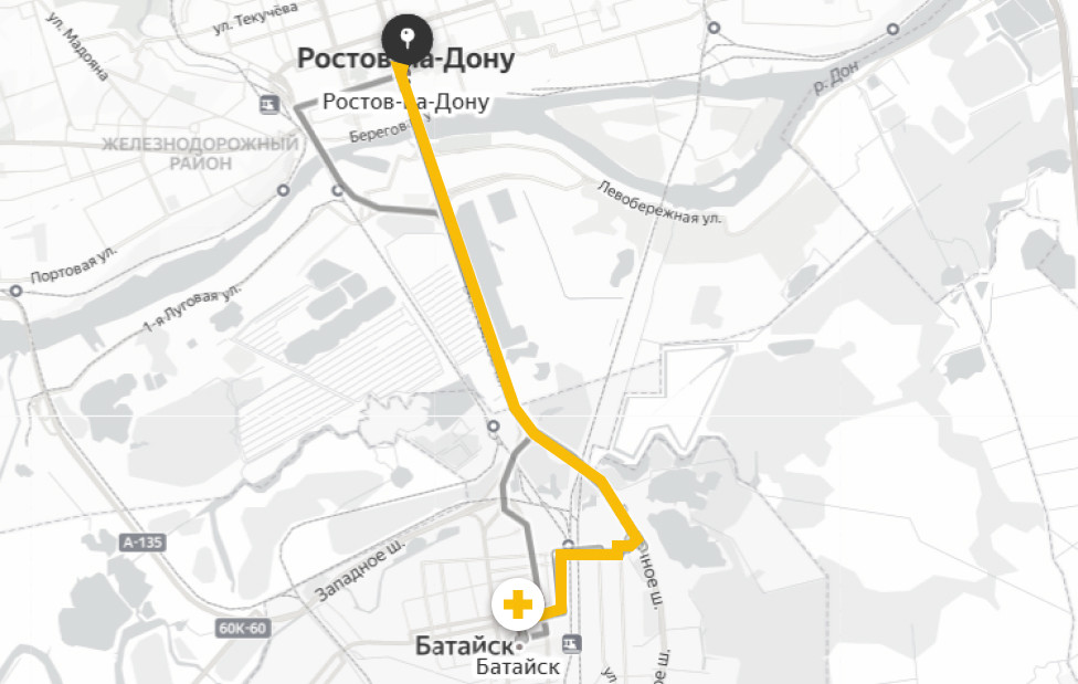 Расстояние Батайск - Ростов-на-Дону по трассе составляет 8 км.