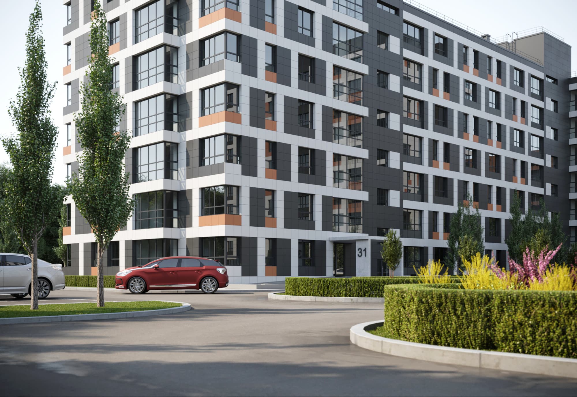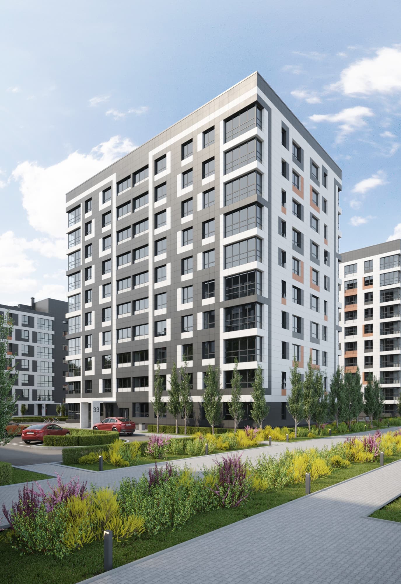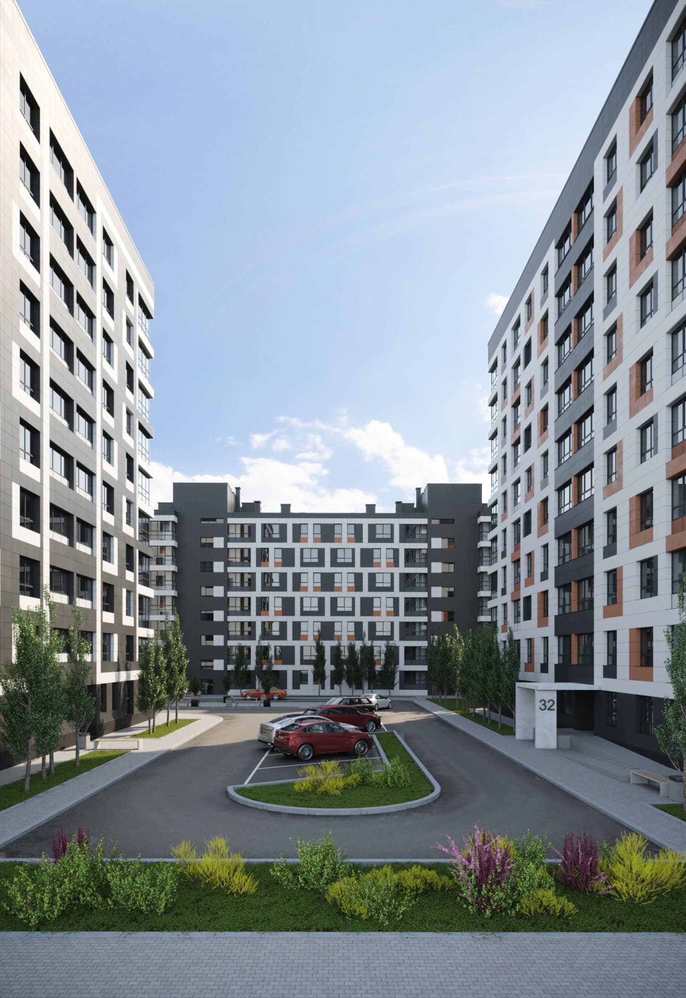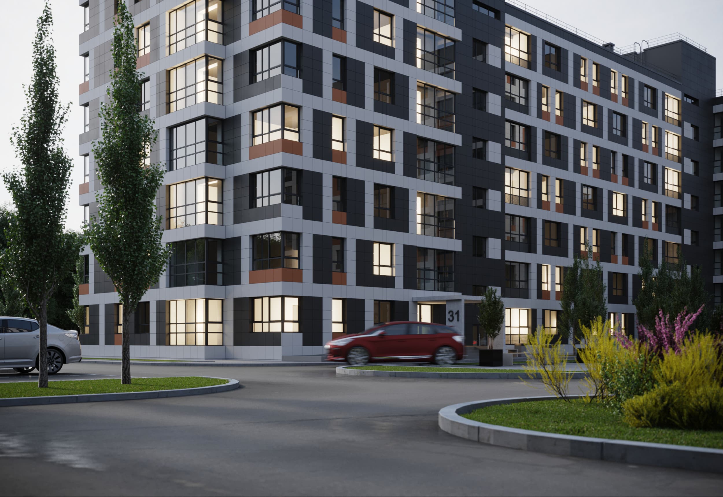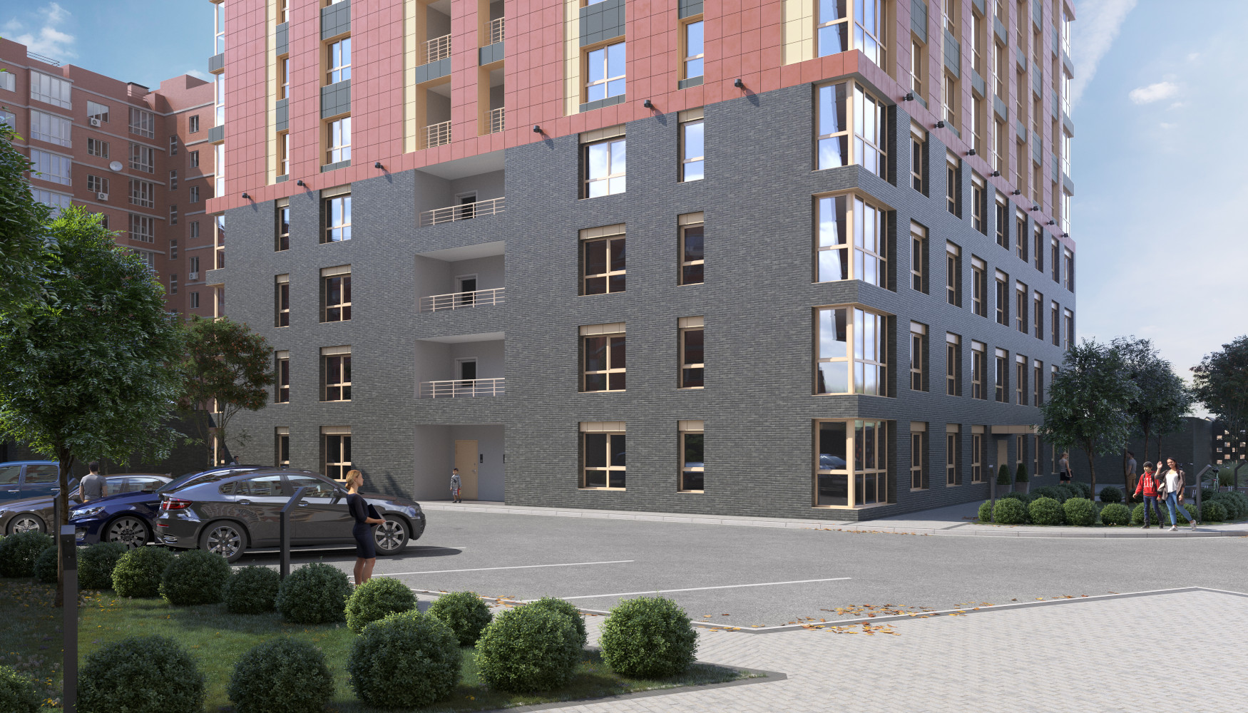 Благоустройство зелеными насаждениями. Игровые площадки с прорезиненным покрытием. Парковочные места возле дома и закрытый паркинг.