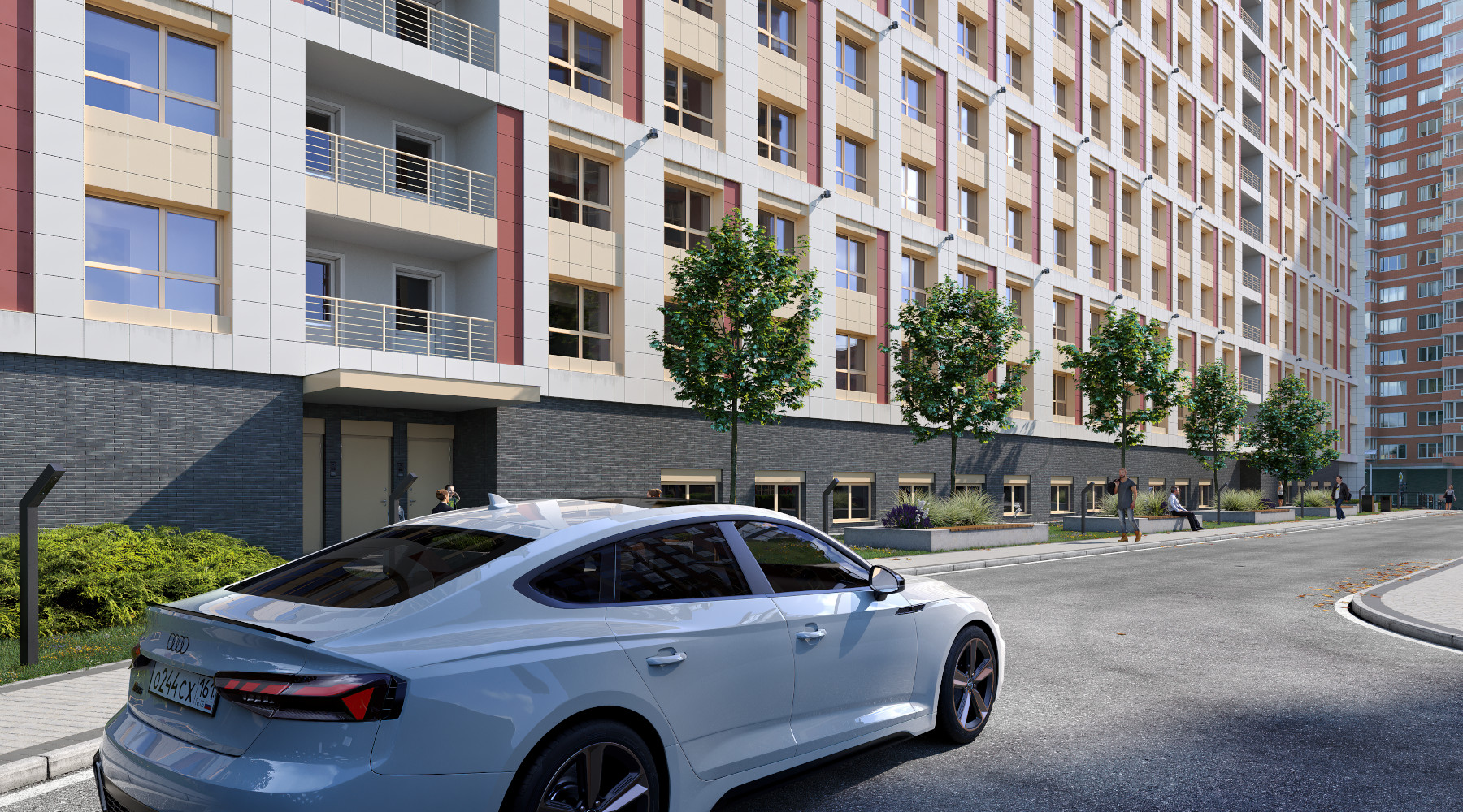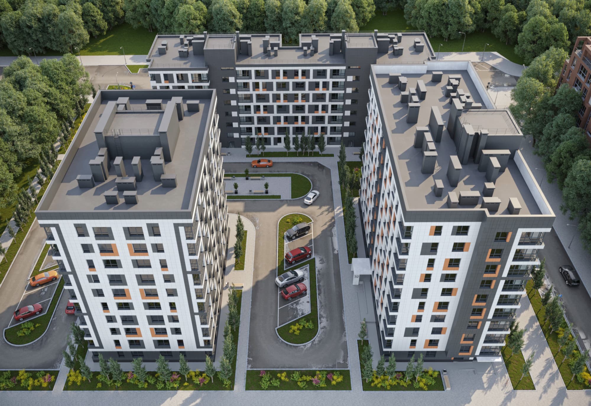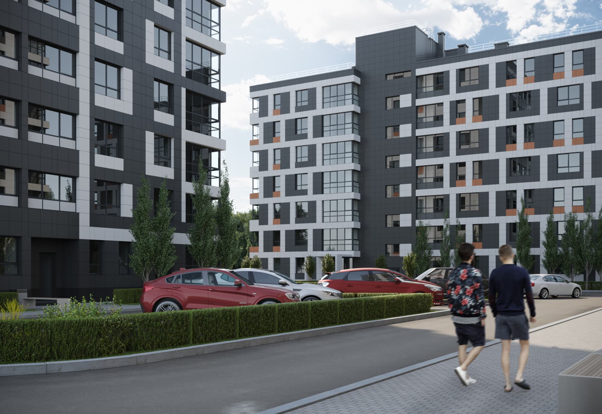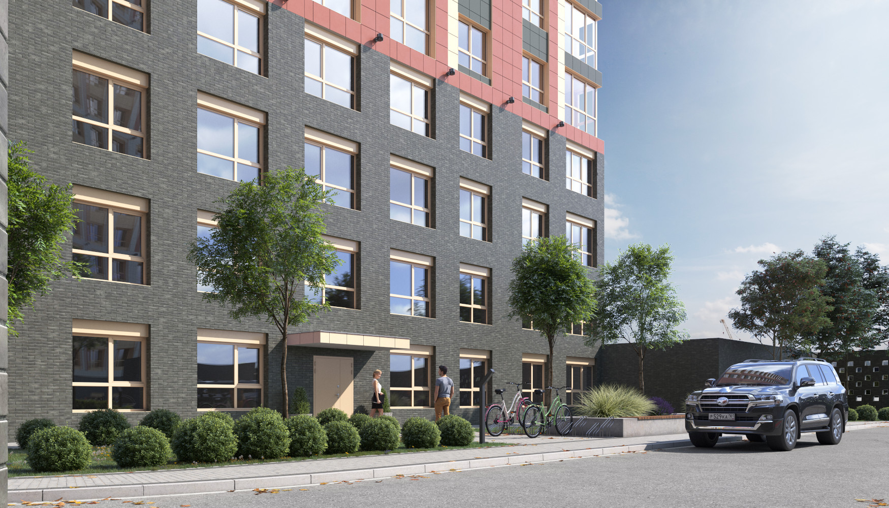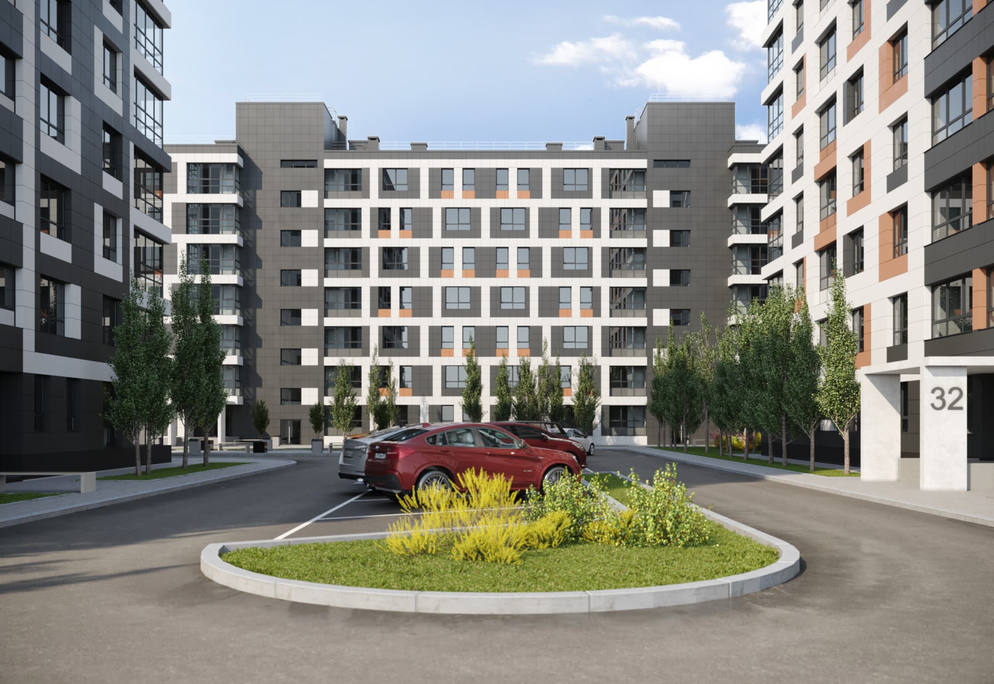 Благоустройство зелеными насаждениями. Игровые площадки с прорезиненным покрытием. Парковочные места возле дома и закрытый паркинг.