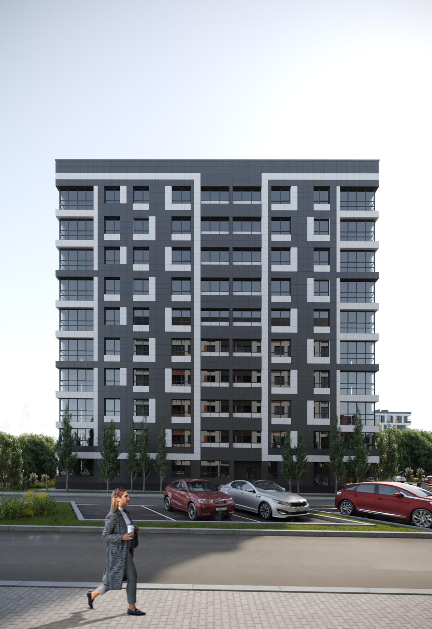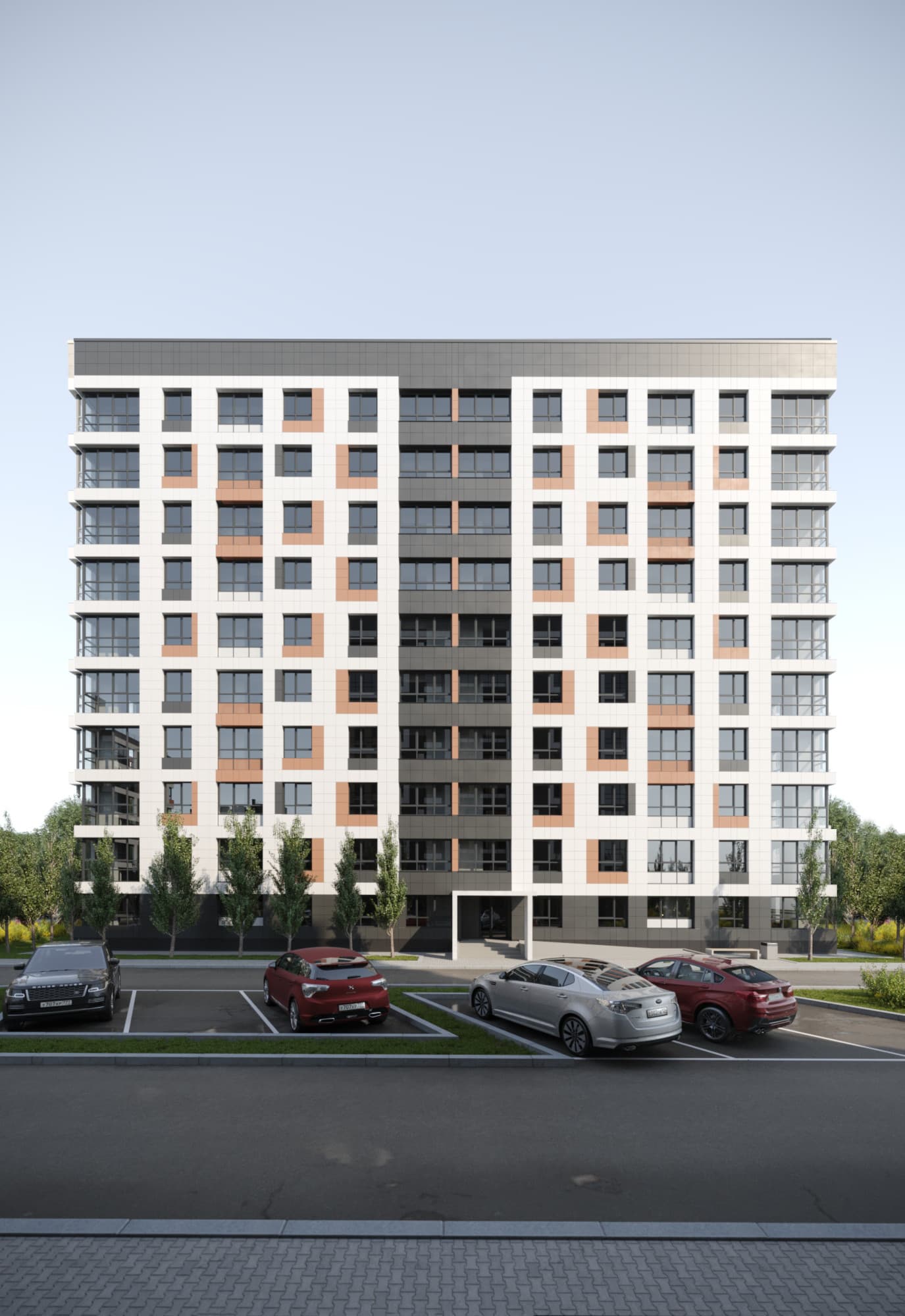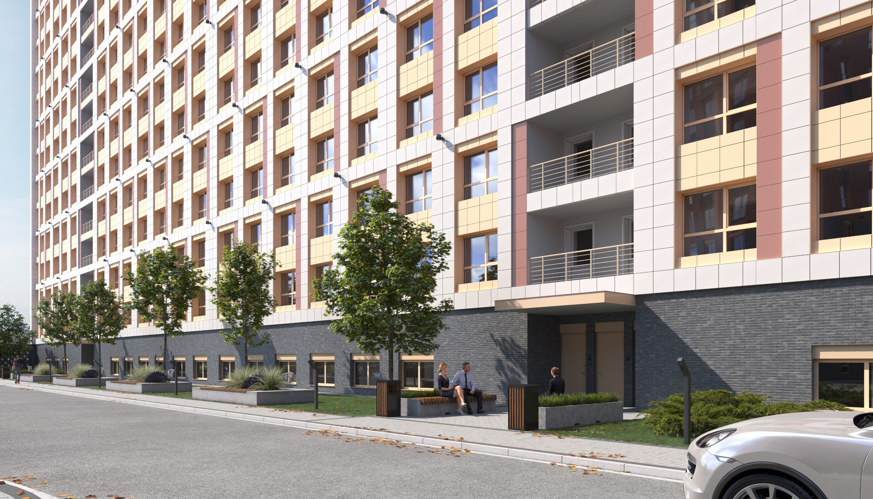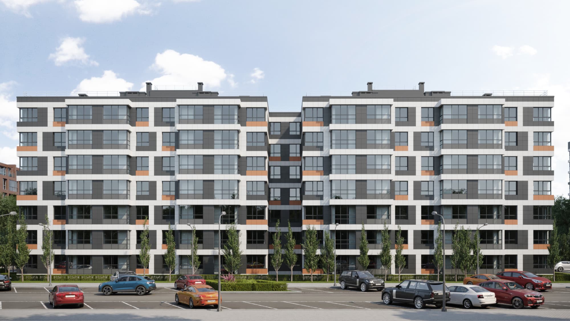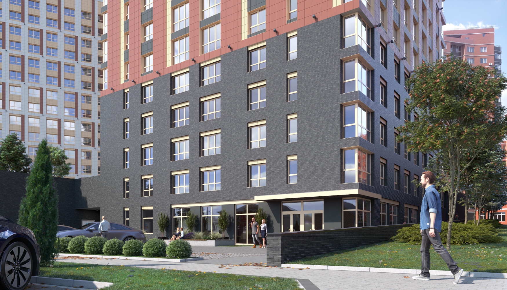 Благоустройство зелеными насаждениями. Игровые площадки с прорезиненным покрытием. Парковочные места возле дома и закрытый паркинг.