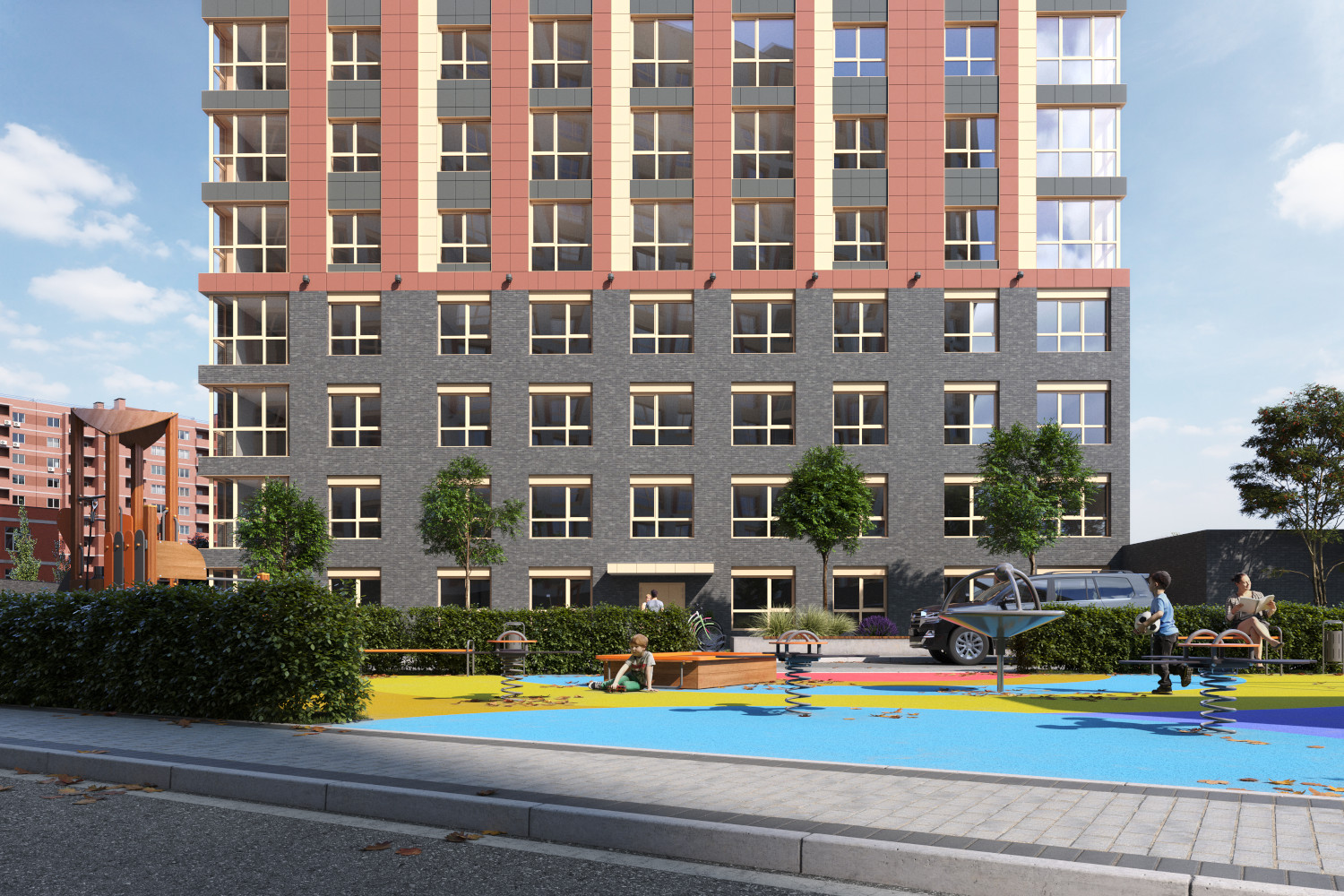 Будьте уверены, что за Вашими детьми присмотрят профессиональные воспитатели-педагоги в двух детских садах, которые находятся непосредственно на территории, рядом с жилым комплексом:Благоустроенная территория